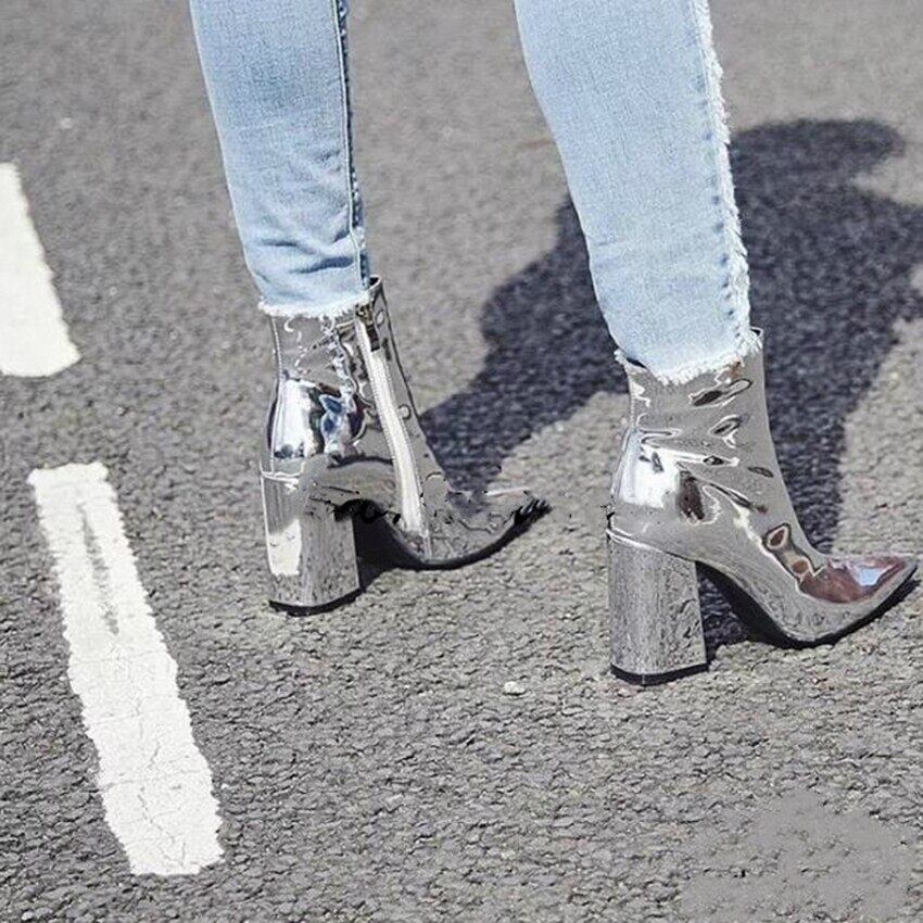 8 センチ ブランドスライバーゴールド 足首 靴下 ブーツ 分 厚い ハイヒール パテントレザー 秋 セクシー ブーツ パンクブーツ レディース 冬 靴